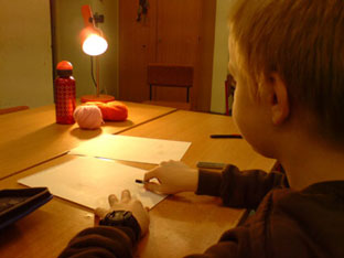 "Handpuppe Schnatterinchen"Bleistift, schwarze Kreide